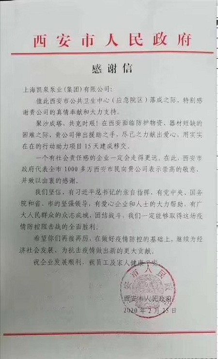 集团收到西安人民政府感谢信